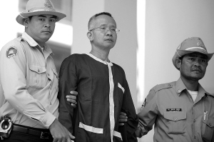 1月18日,在柬埔寨首都金边,“泰国爱国者网络”领导人威拉(中)前往柬埔寨上诉法庭出席庭审。 柬埔寨上诉(中级)法庭当日准予被柬方扣押的4名泰国人取保候审。至此,在被柬方扣押的7名泰国人中已有6人获得取保候审,但是“泰国爱国者网络”领导人威拉的保释要求遭到拒绝。 新华社/法新