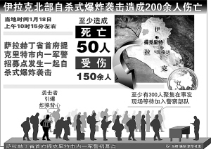 伊拉克前总统萨达姆·侯赛因的家乡提克里特市一处警察招募点18日发生自杀爆炸,大约50人死亡,150人受伤。