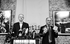 | 1月17日,瑞士宝盛集团前高管埃尔默(右)将2000名银行客户的资料信息交给维基揭秘网站创始人阿桑奇。 (来源:中国日报网站) |