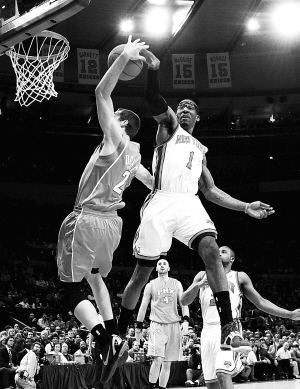 尼克斯队斯塔德迈尔(上右)在比赛中封盖太阳队德拉吉奇(上左)的上篮。 新华社发