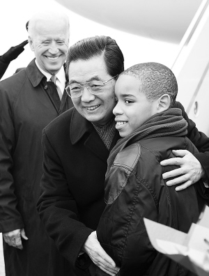 | 1月18日,国家主席胡锦涛乘专机抵达华盛顿,开始对美国进行国事访问。美国副总统拜登到机场迎接。胡锦涛主席亲切拥抱献花的美国少年。 新华社发 |