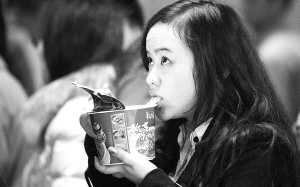 ↑1月19日,海口港,一位着急回家的女孩边排队验票,边抓紧时间吃方便面充饥。 本报记者 张杰 摄
