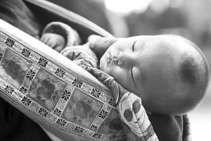 →1月19日,海口港,在母亲背后熟睡的孩子。随父母回家的孩子成为春运长途迁徙过程中,一道艰辛而温情的风景线。 本报记者 张杰 摄