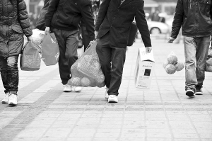 ↑1月19日,海口汽车西站广场赶路的乘客。 本报记者 古月 摄