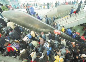 1月19日,重庆火车北站的人流。 当日,2011年铁路春运正式启动。2011年铁路春运自2011年1月19日起至2月27日止,为期40天。春运期间,全国铁路预计发送旅客2.3亿人次,同比增加2554万人次,增长12.5%,日均575万人次。其中,发送直通旅客9200万人次,同比增长11.6%。 新华社记者周衡义摄