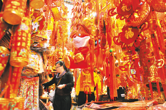 火红的灯笼、各式的春联、可爱的兔儿爷……随着春节的临近,椰城的大街小巷年味渐浓。图为一月二十一日,海口市博爱路,市民正在选购新年饰品。 本报记者 王凯 摄