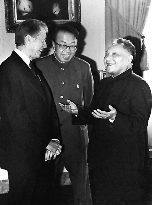 这是一九七九年一月二十九日,美国总统卡特和邓小平副总理在华盛顿白宫会谈前交谈。冀朝铸(中)担任翻译。