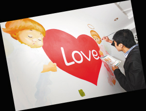 | ←柳阳在墙壁上绘制爱心天使。