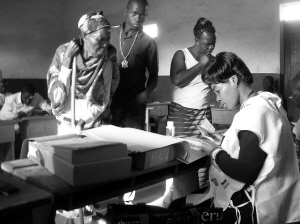 1月23日,在中非城市班吉,人们在一个投票站投票。