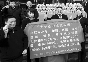 1月23日,陈光标(右二)等在捐赠仪式上展示捐赠牌。 当日,由全国道德模范陈光标发起的中国企业家“光标爱心团”在南京黄埔防灾减灾培训中心举行捐赠仪式,向全国红军小学以及新疆、西藏、云南、贵州、甘肃和江苏北部等部分老少边穷地区捐赠款物1.27亿元,给困难群众送上春节的慰问和关爱。 新华社记者孙参摄