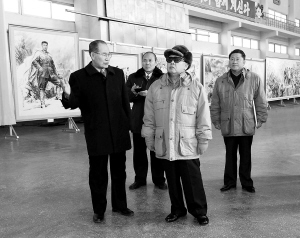 朝鲜中央通讯社1月23日提供的照片显示,朝鲜最高领导人金正日(前右)近日视察了万寿台创作社。 他要求创作社的艺术家进一步发展“主体”艺术,创作更多具有高度的思想和艺术价值的作品。 新华社/朝中社