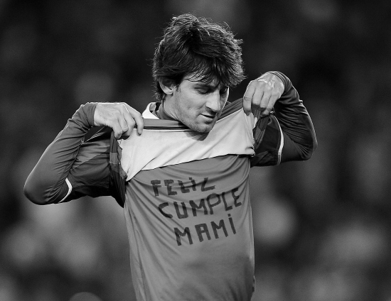 北京时间1月23日凌晨,在西甲联赛第20轮比赛中,巴塞罗那队主场以3:0战胜桑坦德竞技。图为梅西进球后展示穿在身上的印有“妈妈生日快乐”的T恤衫。 新华社发