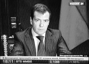1月24日,俄罗斯总统梅德韦杰夫通过电视表示,已下令有关部门组建调查小组,侦破当天发生的莫斯科多莫杰多沃机场爆炸案。俄强力机关已将其作为恐怖袭击立案侦查。 新华社记者 赵嘉麟 摄