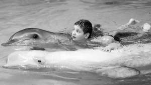 1月23日,一个男孩在俄罗斯索契附近的一海豚馆内与海豚游泳。研究人员称,与海豚嬉戏玩耍可以有效减轻抑郁症患者的症状。 新华社/法新