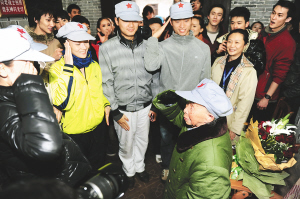 | 中央芭蕾舞团演员与娘子军老战士王运梅互致军礼。 特约记者 蒙钟德 摄