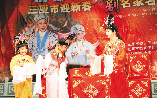 1月24日晚,由三亚市委、市政府主办、三亚市委宣传部承办的《三亚市迎新春名家名段演唱晚会》在鹿回头广场举行,三名少年演员演唱的《张文秀》选段“劝教”赢得满堂喝彩。 本报记者 苏建强 摄