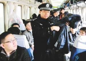 1月24日,一名铁警在车厢内为乘客传授防盗要领。 当日是春运的第六天,广西南宁铁路公安派出警力,保春运,保安全,保畅通。 新华社发(刘君 摄)