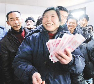 1月24日,河北省秦皇岛市一家船舶工程公司来自吉林的工人于秀春展示提前领到的工资。 当日,该公司为即将回家过年的340名外来务工人员提前发放了今年1月份的工资。据了解,该公司还将为春节后返回公司继续工作的外来务工人员报销往返路费。 新华社发(王寒植 摄)