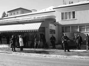 1月27日,记者们在瑞士达沃斯发生轻微爆炸的酒店附近采访。 瑞士达沃斯POST酒店当日发生轻微爆炸,酒店两块玻璃被炸碎,没有造成人员伤亡。据了解,轻微爆炸是部分示威者投掷爆炸物引发的。 新华记者杨敬忠摄