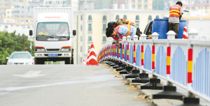 洁净道路栏杆。 本栏图片均由本报记者 苏建强 摄