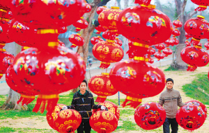 1月27日上午,在新改造好的海口市红城湖畔,工作人员正在将千盏大红灯笼挂上树梢。 本报记者 张杰 摄
