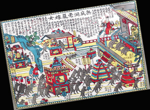 我的童年,是在江苏乡下的外婆家度过的。每逢过年,贴年画是外婆最认真的事,她总是亲手张贴,叫儿孙在一旁看高矮平齐。她最喜欢诸如《穆桂英挂帅》《樊梨花征西》之类的连环年画,将堂屋两壁贴得满满的,旧屋里一下子富丽堂皇起来,真是新年新气象。如今,外婆早过世,但那时贴年画的热闹情景,年画那绚烂喜庆的图象,我难于忘却。