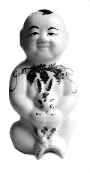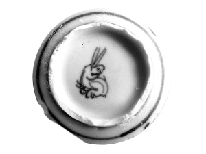 “童子抱兔”底部还有一个椭圆形的印章痕迹,图文已然不清,估计是坯子未干时盖上去的,仿佛是某个瓷窑的某种标志,但是具体的历史信息是什么,恐怕还需要深入考查和论证。