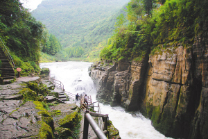 进入景区后完全要步行了。一米多宽的水泥石梯在不断变换的风景中向前延伸,时而在怪石嶙峋的“龙门石林”里穿行,时而在青绿的山谷中蜿蜒,时而从“一线天”的石缝中挤过,各有其趣,不觉疲累。