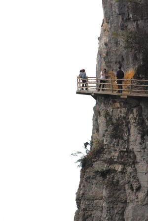 “绝壁栈道”是恩施大峡谷景区最“惊”的景点,它长480多米,位于海拔1700余米、净高差300余米之绝壁山腰间。虽然地面是水泥板铺成,宽度也比华山的“龙脊”宽些,但石板下完全悬空,仿佛在群山之巅、云中漫步。