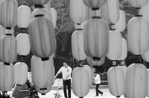 1月29日,海口市南海大道街边挂起一盏盏红灯笼,吸引行人驻足观看。 本报记者 李英挺 摄