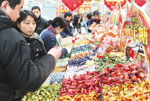 1月31日,顾客在上海市共和新路附近的一家大型超市内选购年货。 上海市质监部门于1月30日公布了年货抽检数据,总体抽样合格率达96.7%。据悉,上海市春节前年货抽检包括炒货、巧克力、米制品、糕点面包和蜜饯在内的5类食品共184批次。 新华社记者 陈飞 摄