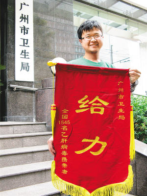 | 反乙肝歧视人士雷闯在得知广州市卫生局查处广东省电力一局医院后,准备向广州市卫生局赠送“给力”锦旗。 新华社发 |