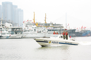 | 边防海警46001艇官兵乘坐摩托艇在港区巡逻。本报记者 魏如松 通讯员 林小策 摄 |