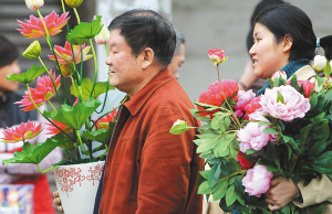 | ↑ 2月1日,海口市博爱南路,市民买些仿真花,增加春节的喜庆气氛。