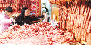 | ↑ 2月1日,海口市国兴大道一家超市,市民在挑选腊肠。