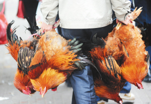 | ↓ 2月1日,有“无鸡不成年”传统的琼海节前鸡市异常火爆,一位市民一次购买数只阉鸡。 特约记者 蒙钟德 摄 |