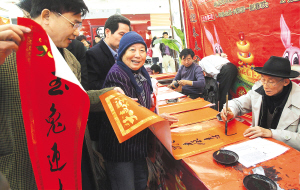 | ↑ 2月1日,海口市国兴大道一家商场出口处,书法爱好者为市民写春联。 本报记者 李英挺 摄 |