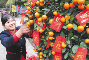| ↑ 2月1日,海口某酒店的服务员在年桔上挂满大吉大利的红包。 本报记者 王凯 摄 |