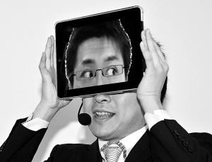 2月1日,一名日本魔术师在东京用苹果iPad平板电脑变魔术。 新华社/法新