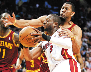 | 北京时间2月1日,在NBA常规赛中,迈阿密热火队主场以117:90战胜克里夫兰骑士队。图为热火队球员韦德(下)持球突破。 新华社发 |