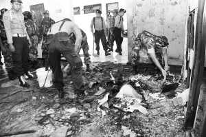 2月9日,在印度尼西亚中爪哇省淡满光县,警察和士兵在被损毁的建筑内清理物品残骸。 印度尼西亚中爪哇省8日发生宗教冲突,导致3座基督教教堂被损毁,至少9人受伤。 新华社/法新