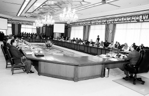2月9日,巴基斯坦总理吉拉尼(右)在伊斯兰堡出席内阁会议。 巴基斯坦总理吉拉尼9日在内阁会议上接受所有内阁部长的辞呈,这意味着巴现内阁宣告解散。巴官员表示,吉拉尼将在近期重新组建一个规模较小的内阁,以减少开支,提升政府形象。 新华社/法新
