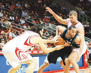 2月8日,在2010-2011赛季NBA常规赛中,休斯敦火箭队主场以108比112负于明尼苏达森林狼队。图为森林狼队球员埃灵顿(中)试图摆脱火箭队球员巴蒂尔(右)、斯科拉的包夹防守。新华社发