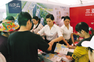 同样受到欢迎的楼盘还有许多,澄迈的中华坊以其每平方米不到5000元的公寓价格倍受关注,每天发放1000多份资料。即将开盘的中铁·子悦薹只是在展会上进行品牌宣传,每天发放2000多份资料,乘看房车去项目现场的客户络绎不绝。