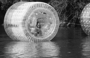 ←春节期间,海口东湖推出水上游玩新项目水滚桶,深受小朋友们的喜爱。