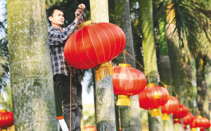 | 二月九日,海口市琼山区红城湖路,工作人员正在抓紧时间悬挂灯笼,为一年一度的府城元宵换花节营造喜庆气氛。 本报记者 李英挺 摄 |