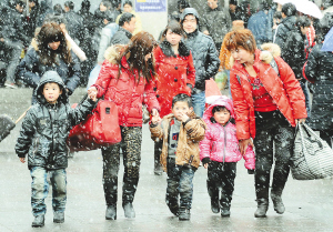 2月9日,几位刚下车的旅客走出车站。当日,中原地区降下今年的第一场雪。由于正值节后春运高峰,在郑州火车站站前广场和候车大厅前,都聚集了大批旅客。郑州火车站采取多项措施,克服雨雪天气给春运带来的困难,确保旅客安全、顺利踏上归程。 中央气象台预计,未来24小时,中部地区雨雪天气还将持续。同时,北京也将在这次大范围的雨雪天气中迎来去冬今春的第一场雪,改变100多天无有效降水的干燥局面。 新华社记者 王颂 摄