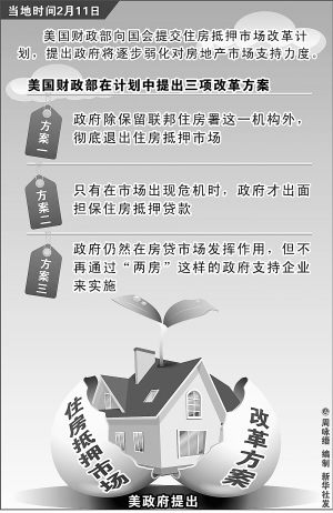 以美国两大房地产抵押贷款机构房地美和房利美(合称“两房”)为核心的美国住房抵押市场改革11日拉开序幕。美国财政部当天向国会提交住房抵押市场改革计划,政府将逐步弱化对房地产市场支持力度。
