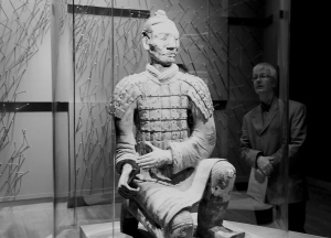 | 在“中国秦兵马俑展”上,一名参观者观看跪射俑。 新华社发 |