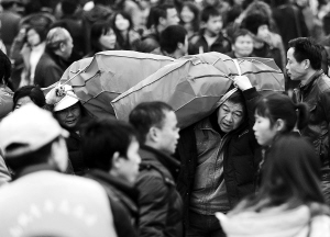 2月19日,在南昌火车站附近,返城旅客背着行李走在人群中。 元宵节后,记者在全国节后农民工出行四大中转站之一的南昌火车站看到,熙熙攘攘的人群中,众多农民工又肩背手提大包小包从农村返城。春节与家人短暂的团聚之后,他们满怀希望再一次踏上外出打工之路。 新华社记者 周科 摄